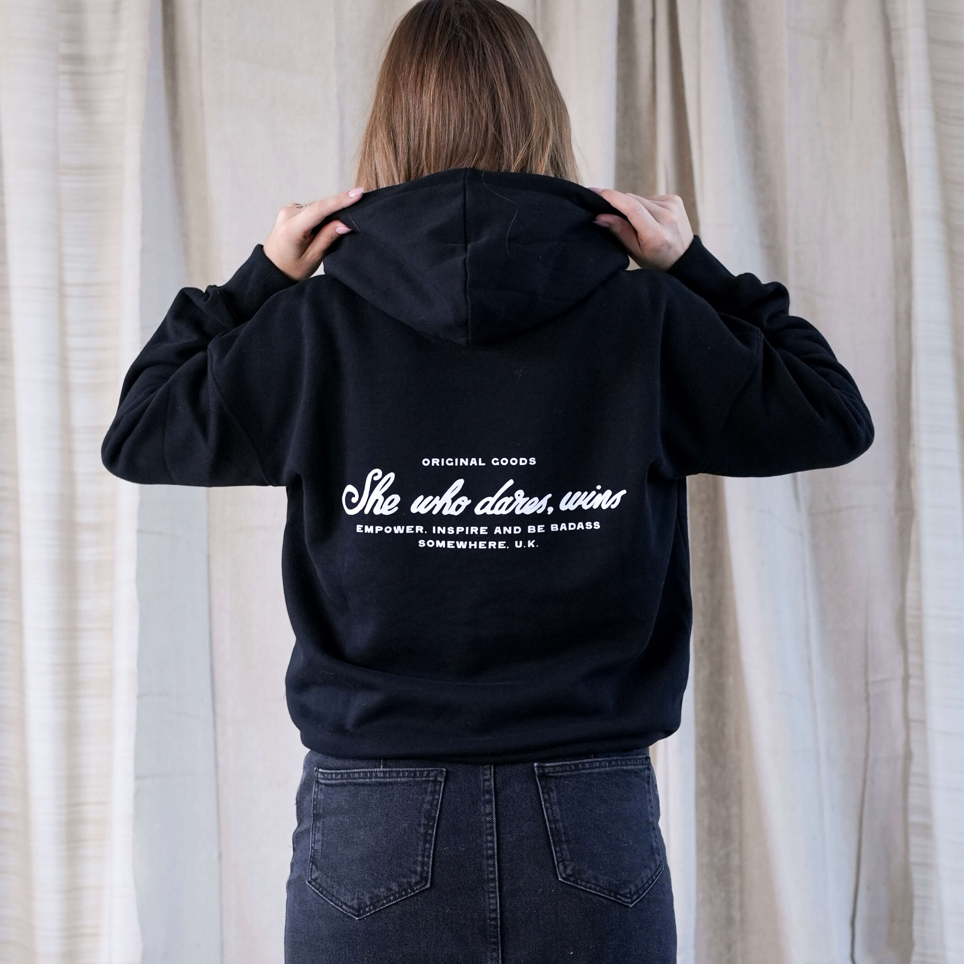 Step into authenticity with the Original Goods Heavyweight Hoodie, a bold statement of courage and self-determination. Emblazoned with the powerful mantra "She Who Dares Wins," this hoodie is more than just clothing—it's your armor in the journey to live boldly and unapologetically. Designed for trailblazers, it's a tribute to those who carve their own path with genuine courage and fierce determination.