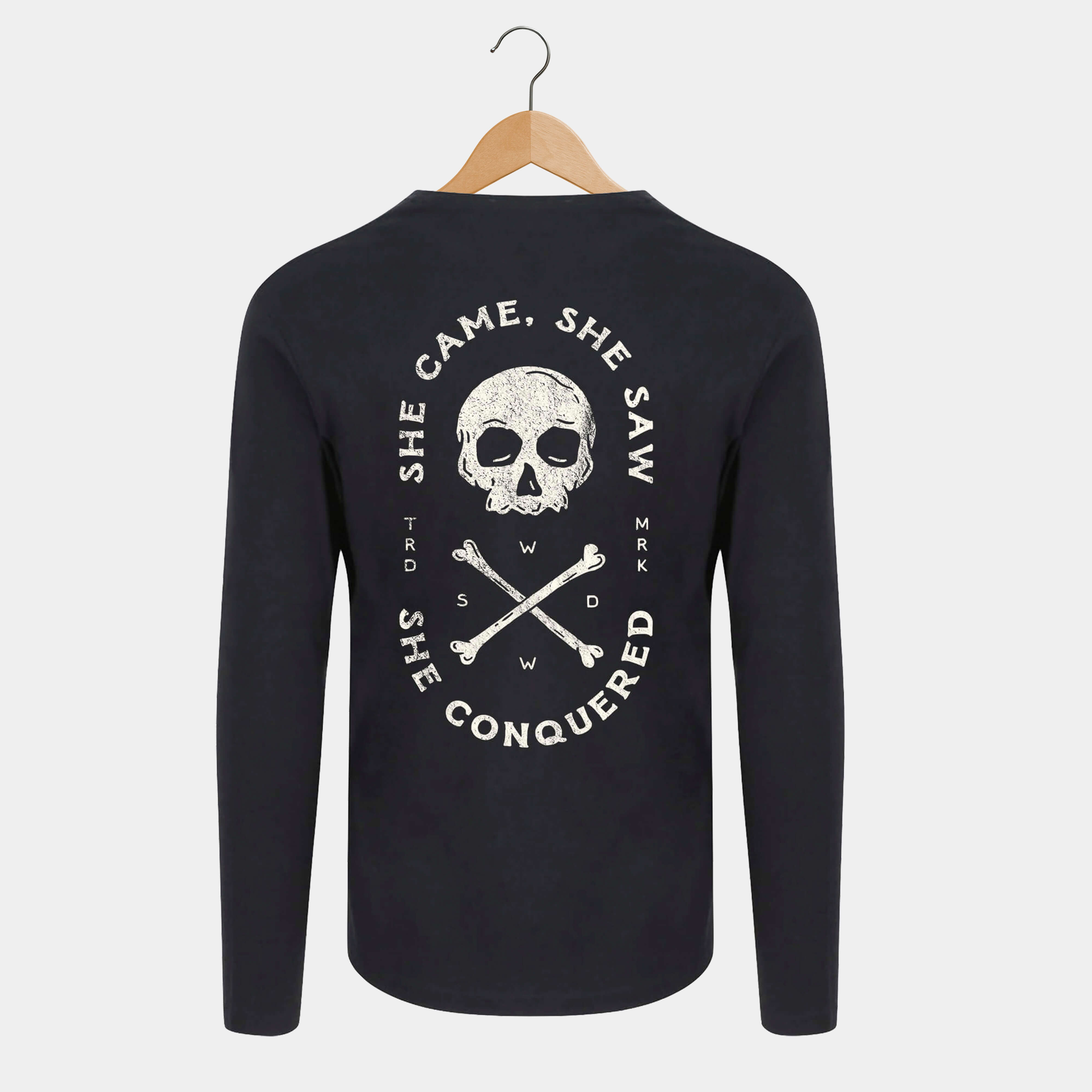 Featuring our very own badass skull and bones hand-drawn design. The design was inspired by all the women out there who don't give up and fearlessly achieve their goals! This is one of our first vintage prints and we love the way the ink looks slightly crackled like it's your favorite tee from back in the day.